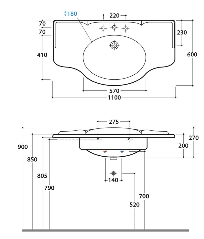 С одним отверстием для смесителя (два отверстия для смесителя намечены), настенный монтаж, укомплектована крепежными элементами