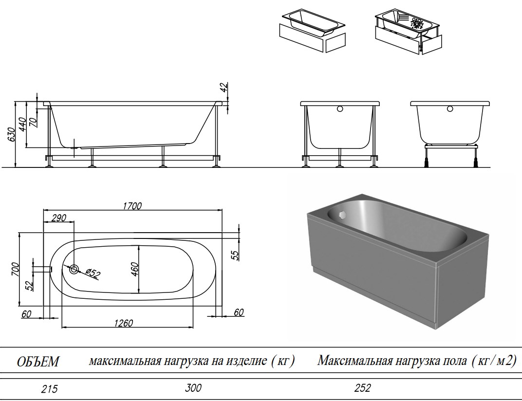 Ванна представлена в 6 востребованных размерах.